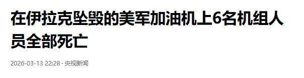 央视新闻的报道,美军承认当地时间2026年3月13日,美国中央司令部表示,一架在伊拉克西部坠毁的美国KC-135空中加油机上的6名机组人员已全部确认死亡。美国中央司令部通报:“美国空军KC-135加油机在伊拉克坠毁,机上所有机组人员确认遇难。”,一架在伊拉克西部坠毁的美国KC-135加油机上的六名机组人员全部遇难,目前已确认遇难。这架飞机于3月12日“史诗狂怒行动”期间,在友军领空飞行时失事。事件的具体情况正在调查中。但可以确定的是,飞机失事并非由敌方火力或友军火力造成。在通知家属24小时后,才会公布阵亡军人的身份信息。”