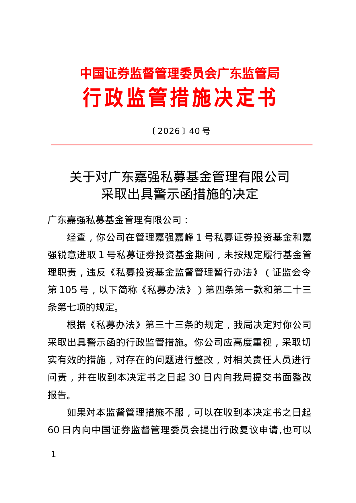 决定书显示,广东嘉强私募基金管理有限公司在管理嘉强嘉峰1号私募证券投资基金和嘉强锐意进取1号私募证券投资基金期间,未按规定履行基金管理职责,违反了《私募投资基金监督管理暂行办法》的规定。