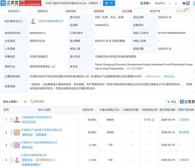 企查查APP显示,近日,天津工融经开股权投资基金合伙企业(有限合伙)成立,出资额10亿人民币,经营范围为以私募基金从事股权投资、投资管理、资产管理等活动。企查查股权穿透显示,该企业由工银金融资产投资有限公司、工银资本管理有限公司等共同出资。
