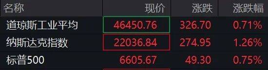 截至发稿,纳指涨1.26%,道指涨0.71%,标普500指数涨0.75%。
