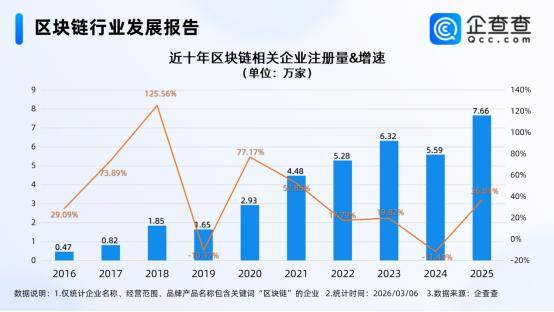 企查查数据显示,截至3月6日,国内现存区块链相关企业29.68万家。近十年区块链相关企业注册量呈整体增长态势,2025年全年注册7.66万家区块链相关企业,同比增长36.83%,创近十年注册量峰值。截至目前,今年已注册1.05万家相关企业。