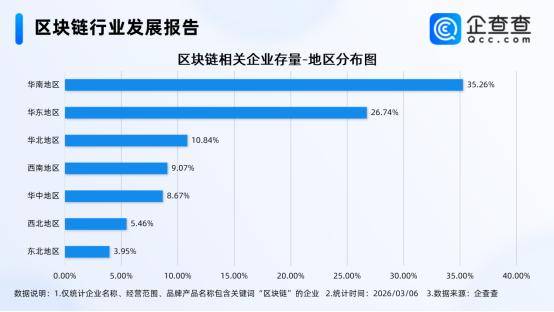 企查查数据显示,截至3月6日,国内现存区块链相关企业29.68万家。近十年区块链相关企业注册量呈整体增长态势,2025年全年注册7.66万家区块链相关企业,同比增长36.83%,创近十年注册量峰值。截至目前,今年已注册1.05万家相关企业。存量方面,区块链相关企业注册资本以轻量级为主,注册资本在200万元以下的区块链相关企业占比超六成;地区分布上,其中分布在华南地区的区块链相关企业最多,占比35.26%,呈现明显的集聚特征。