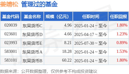 姜靖松先生:中国国籍,上海对外经贸大学金融学硕士。2013年9月至2017年3月就职于中国工商银行上海分行,担任客户经理;2017年3月至2019年6月就职于平安利顺国际货币经纪有限责任公司,担任经纪人;2019年6月至2021年6月就职于西部利得基金管理有限公司,担任债券交易员。2021年7月至2024年12月就职于鑫元基金管理有限公司,历任债券交易员、基金经理助理。2024年12月入职东吴基金管理有限公司,2025年1月24日担任东吴货币市场证券投资基金基金经理。