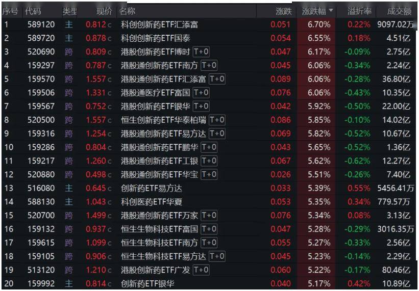 具体来看,科创创新药ETF汇添富以6.7%的涨幅领跑全市场ETF;科创创新药ETF国泰上涨6.55%。此外,还有3只港股创新药ETF和1只港股通医疗ETF涨超6%。成交额方面,港股创新药ETF广发当日以80.46亿元成交额领跑跨境ETF。
