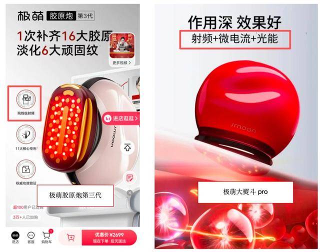 经极萌产品详情页得知,极萌胶原炮第三代拥有院线级射频技术,一台机器约等于胶原填充、射频除皱和线雕提升。极萌大熨斗则采用“射频+微电流+光能”,使用28天改善肌肤初老问题。