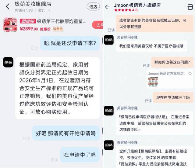 此外,客服还表示:“根据国家药监局规定,家用射频仪分类界定正式起效日期为2026年4月1日,在过渡期内符合安全生产标准的正规产品均可正常销售。”