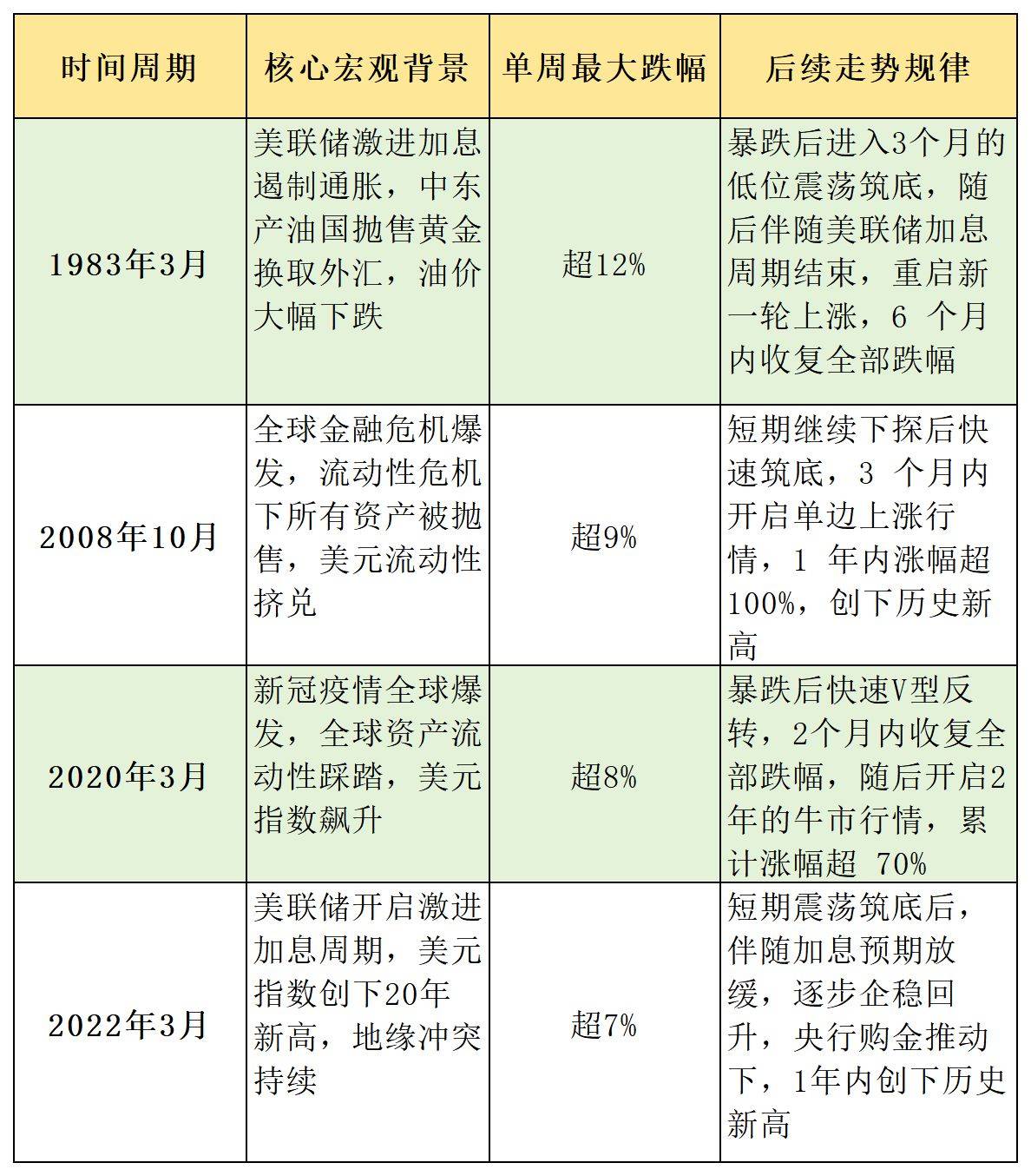 《每日经济新闻》记者选取了与本次黄金行情具备可比性的四轮极端下跌周期,核心特征与后续走势如下: