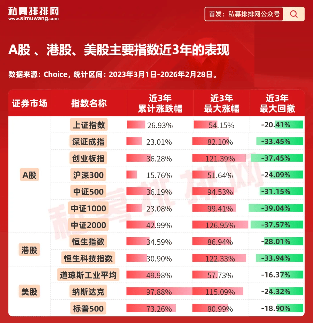 而拉长周期来看,近3年(2023年3月初-2026年2月底)的资本市场由于受逆全球化浪潮等因素冲击,波动非常大。其中,A股、港股主要股指在近3年最大回撤均超20%,回撤相对较小的美股中的道琼斯指数也有超16%的回撤。因此,在这样的市场背景下,要做到低回撤投资,难度是非常大的。