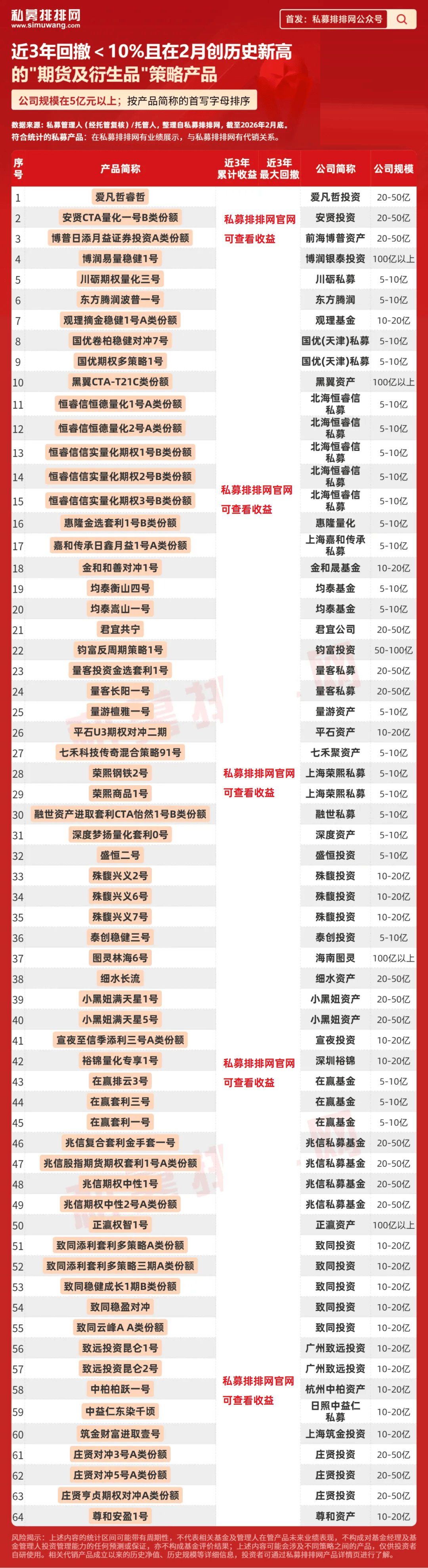 经统计,在私募排排网有近3年业绩展示、近3年最大回撤低于10%且净值在今年2月创下历史新高的私募“期货及衍生品”策略产品共有64只。