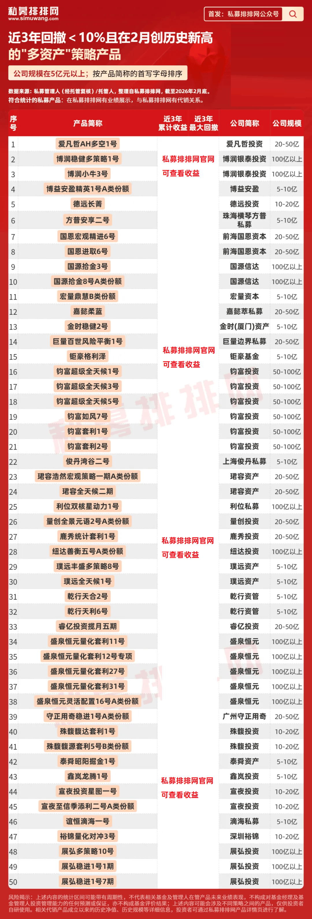 经统计,在私募排排网有近3年业绩展示、近3年最大回撤低于10%且净值在今年2月创下历史新高的私募“多资产”策略产品共有50只。