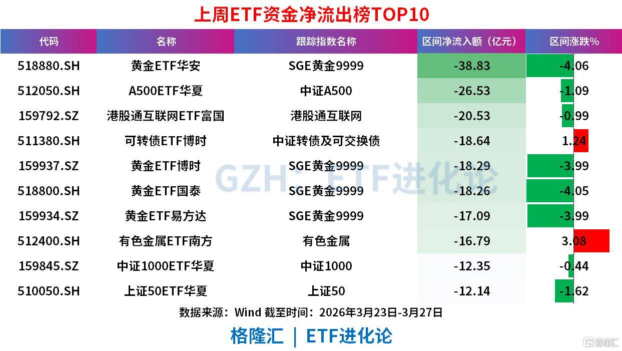 上周(3月23日-3月27日)ETF跟踪指数资金流呈现极致防御+高景气成长分化的格局:AAA科创债、中证短融、沪深300、沪城投债等固收及大盘宽基指数获大额净流入,其中AAA科创债以106.55亿元领跑;而SGE黄金9999、细分化、中证A500、港股通互联网等黄金、中小盘及题材类指数则遭遇显著净流出,资金向低风险固收与确定性更强的大盘资产集中,同时对前期强势的黄金板块进行集中获利了结。