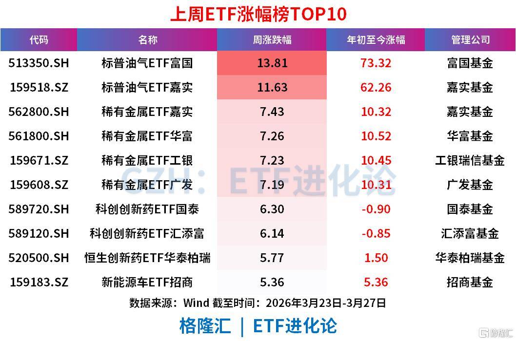 上周(3月23日-3月27日)ETF涨跌幅呈现“海外油气+稀有金属+创新药领涨,科技金融类领跌”的极端分化格局: