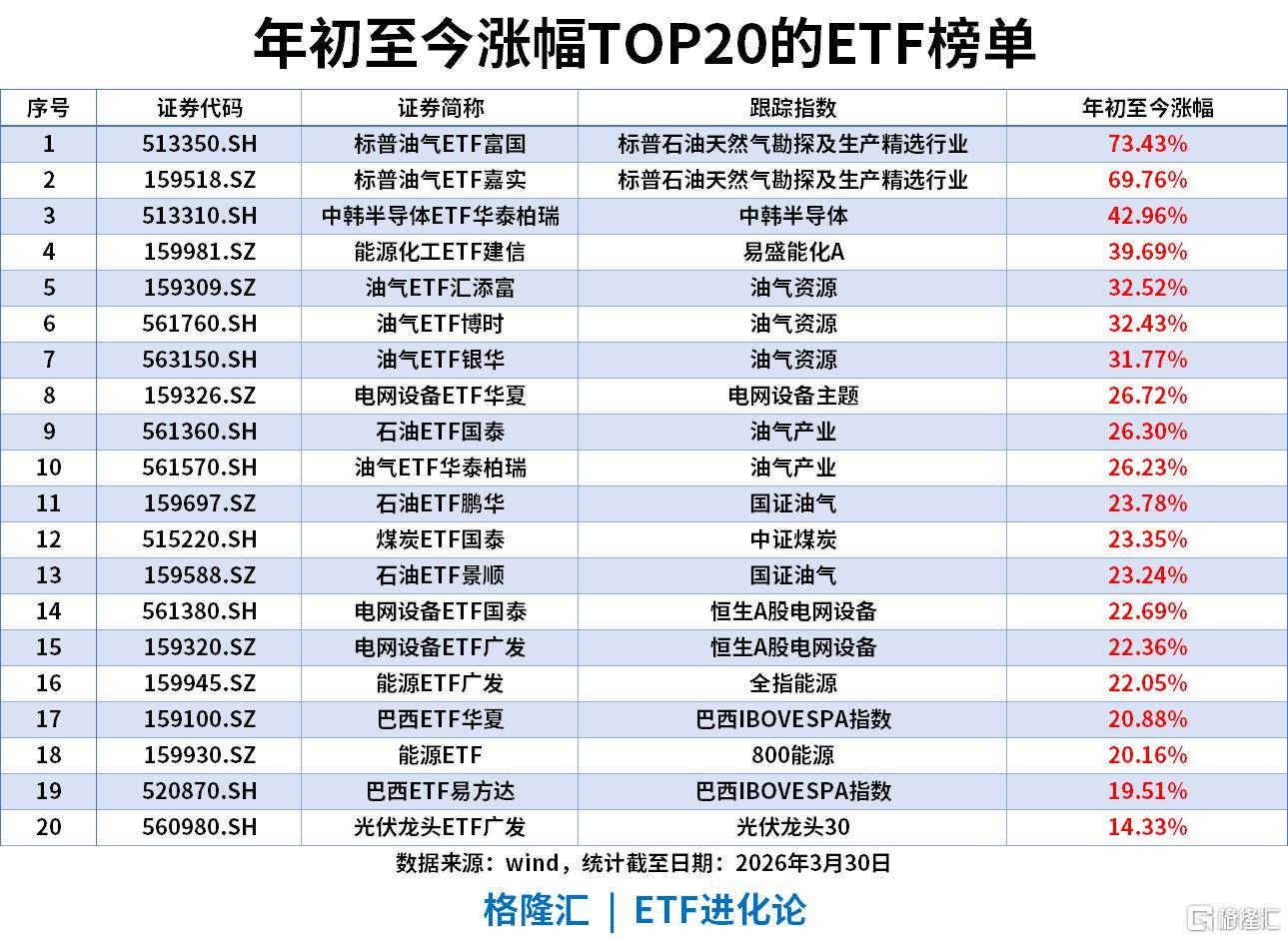 油气资源、能源化工、电网设备、石油、煤炭等能源全产业链ETF批量收获20%-33%涨幅,巴西ETF、光伏龙头ETF也进入榜单,全球资源品与新能源板块全年表现强势。
