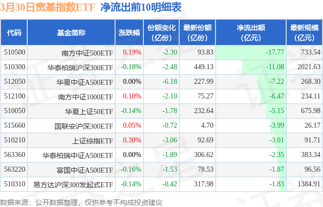 当日有70只宽基指数ETF基金出现资金净流出,其中净流出排首位的是南方中证500ETF(510500),份额减少了2.3亿份,净流出额为17.77亿元。