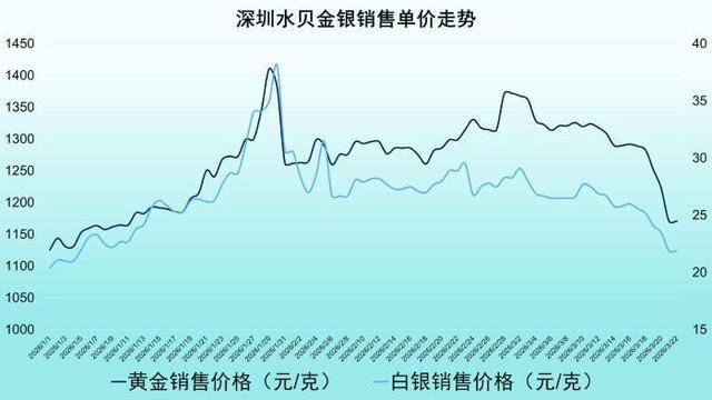 数据显示,开年以来水贝白银销售价格从1月1日的20.4元/克冲高至1月30日的38.1元/克,随后一路震荡下行,截至3月下旬,现货银价已跌至22元/克附近,回收价仅15元/克,部分交易盘甚至触及16元/克的低位。