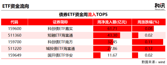 数据显示,债券ETF资金周流入TOP5合计净流入超过156亿元,其中科创债主题产品表现尤为突出。科创债ETF嘉实 以61.71亿元的周净流入额居首,科创债ETF南方也录得32.45亿元的净流入。此外,短融ETF海富通、城投债ETF海富通及国开债ETF华安均获得超10亿元的资金增持。