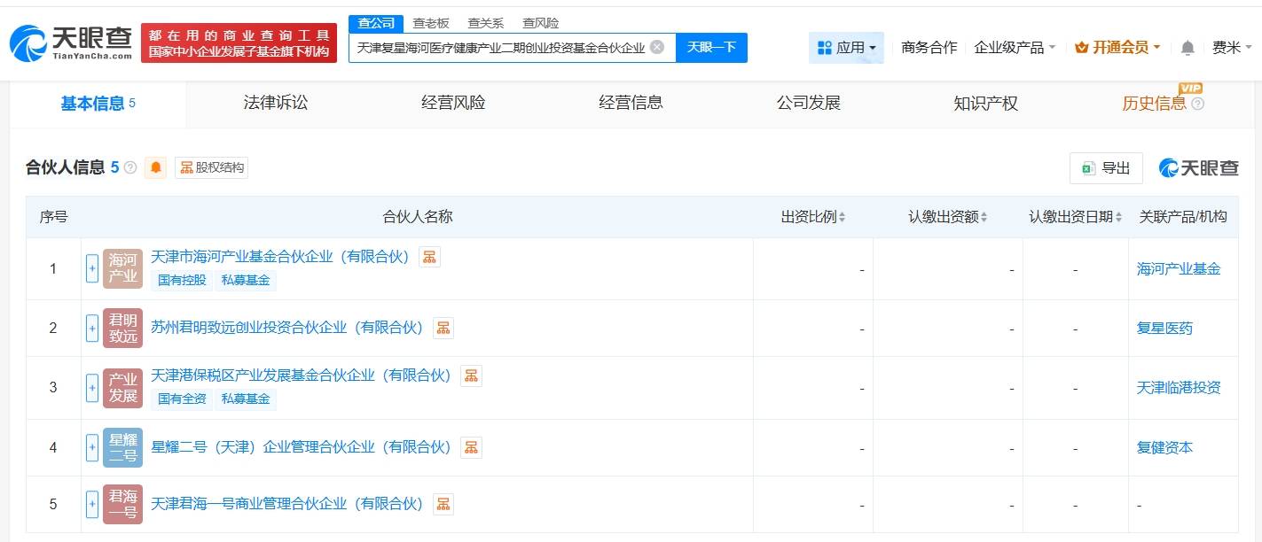 天眼查App显示,近日,天津复星海河医疗健康产业二期创业投资基金合伙企业(有限合伙)成立,执行事务合伙人为星耀二号(天津)企业管理合伙企业(有限合伙),出资额10亿人民币,经营范围为创业投资,以私募基金从事股权投资、投资管理、资产管理等活动。合伙人信息显示,该基金由天津市海河产业基金合伙企业(有限合伙)、复星医药旗下苏州君明致远创业投资合伙企业(有限合伙)、天津港保税区产业发展基金合伙企业(有限合伙)等共同出资。