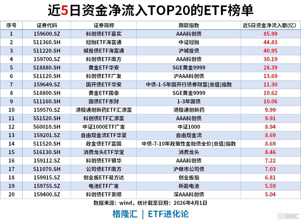 黄金与避险:黄金ETF华安、黄金ETF国泰等黄金相关品种合计流入超13亿,货币基金、城投债等固收类同步获配置,避险需求温和释放。