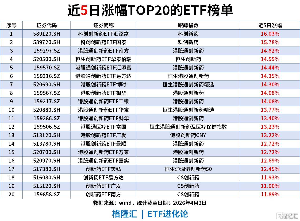 创新药板块:科创新药、港股通创新药等相关ETF包揽榜单多数席位,涨幅集中在11.57%-18.84%区间,科创新药ETF汇添富以18.84%涨幅位列第二,医药创新仍是中期最强风口。