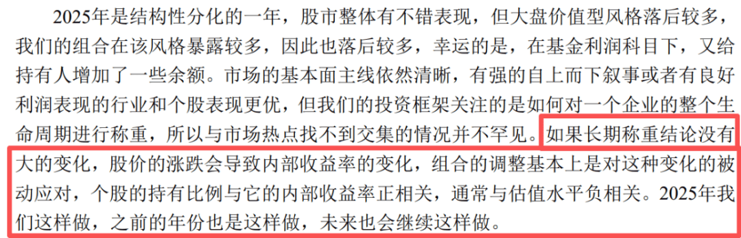 他在年报展望中明确指出,当前估值水平下,已经难言“遍地是黄金”。对于以内部收益率为评估对象的投资人而言,选股的难度正在显著增大。