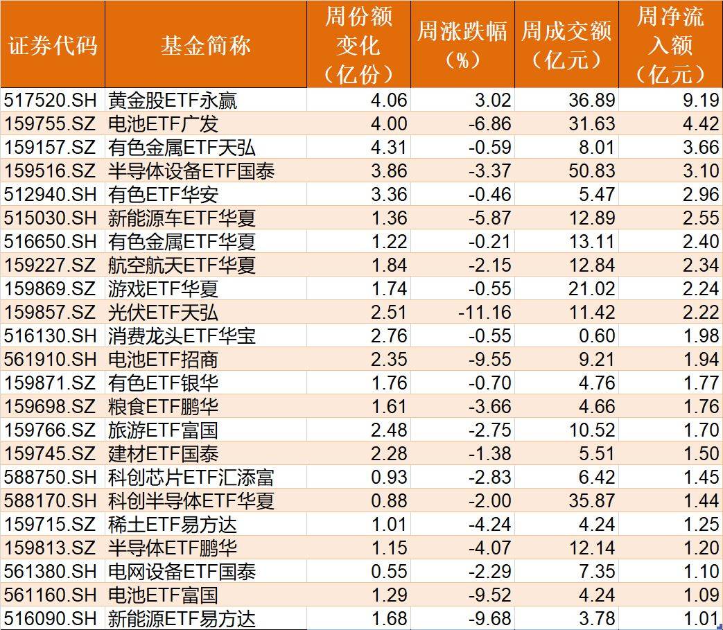在行业主题ETF方面,本周净流入资金超1亿元的基金有23只,其中黄金股ETF永赢、电池ETF广发、有色金属ETF天弘份额分别增加了4.06亿份、4亿份和4.31亿份,净流入资金9.19亿元、4.42亿元和3.66亿元。