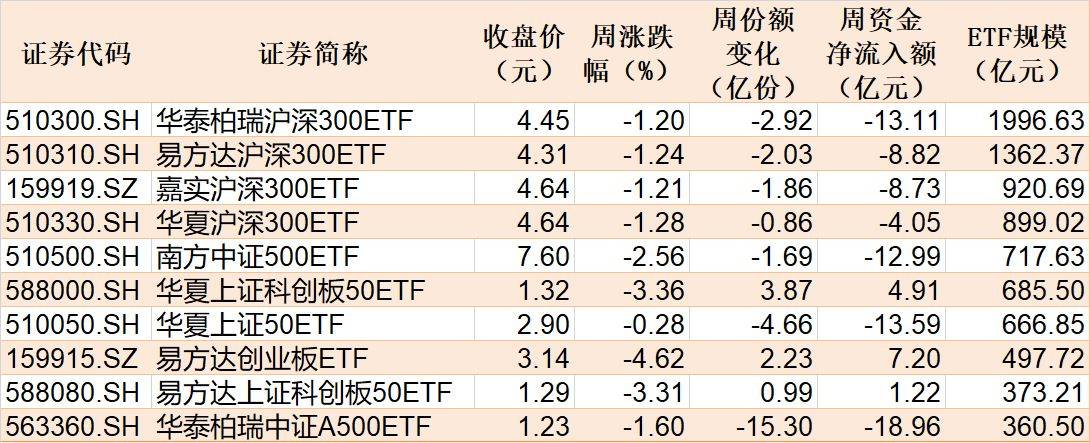 具体ETF方面,规模较大的10只宽基指数ETF本周合计净流出66.93亿元,其中华泰柏瑞沪深300ETF、南方中证500ETF、华夏上证50ETF、华泰柏瑞中证A500ETF净流出均超10亿元。