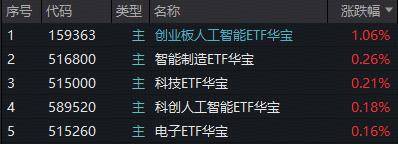 盘面上,泛科技大面积走强。光通信逆市突围,同类规模、流动性第一的创业板人工智能ETF华宝(159363)收涨1.06%;此外,AI、电子等方向表现活跃,科技ETF华宝(515000)、电子ETF华宝(515260)、科创人工智能ETF华宝(589520)、科创芯片ETF华宝(589190)等逆市收涨。