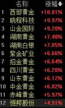 A股早盘贵金属板块持续走强,西部黄金涨停,晓程科技、山金国际涨超9%,湖南黄金、湖南白银涨超7%,紫金矿业、招金黄金、四川黄金、山东黄金、中金黄金涨超6%,赤峰黄金涨近6%。