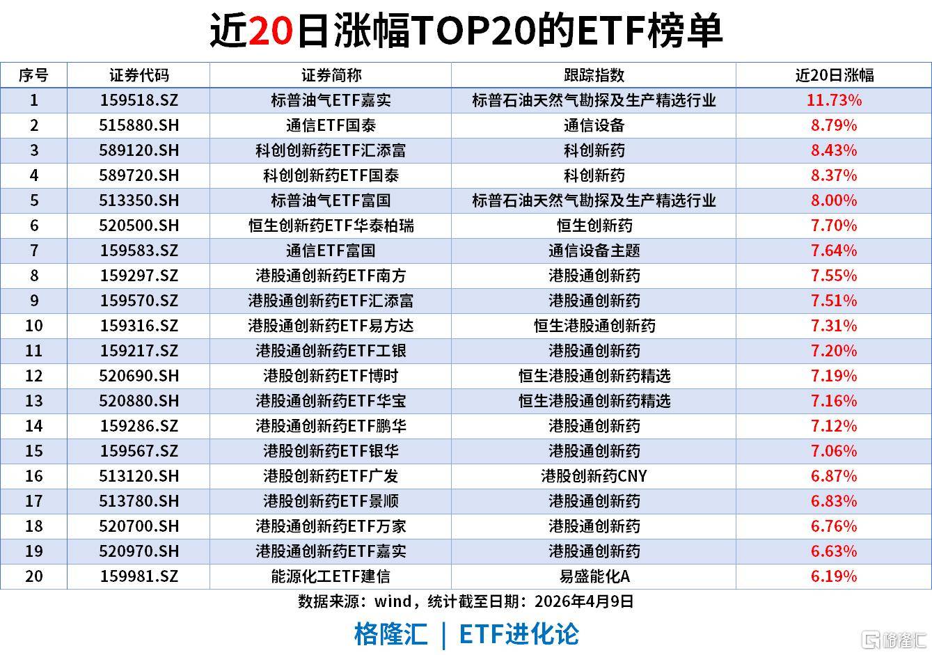 能源、创新药与通信形成多主线轮动格局:标普油气ETF嘉实以11.73%涨幅登顶,科创新药、港股通创新药等相关ETF包揽榜单多数席位,涨幅集中在6.19%-8.43%区间。