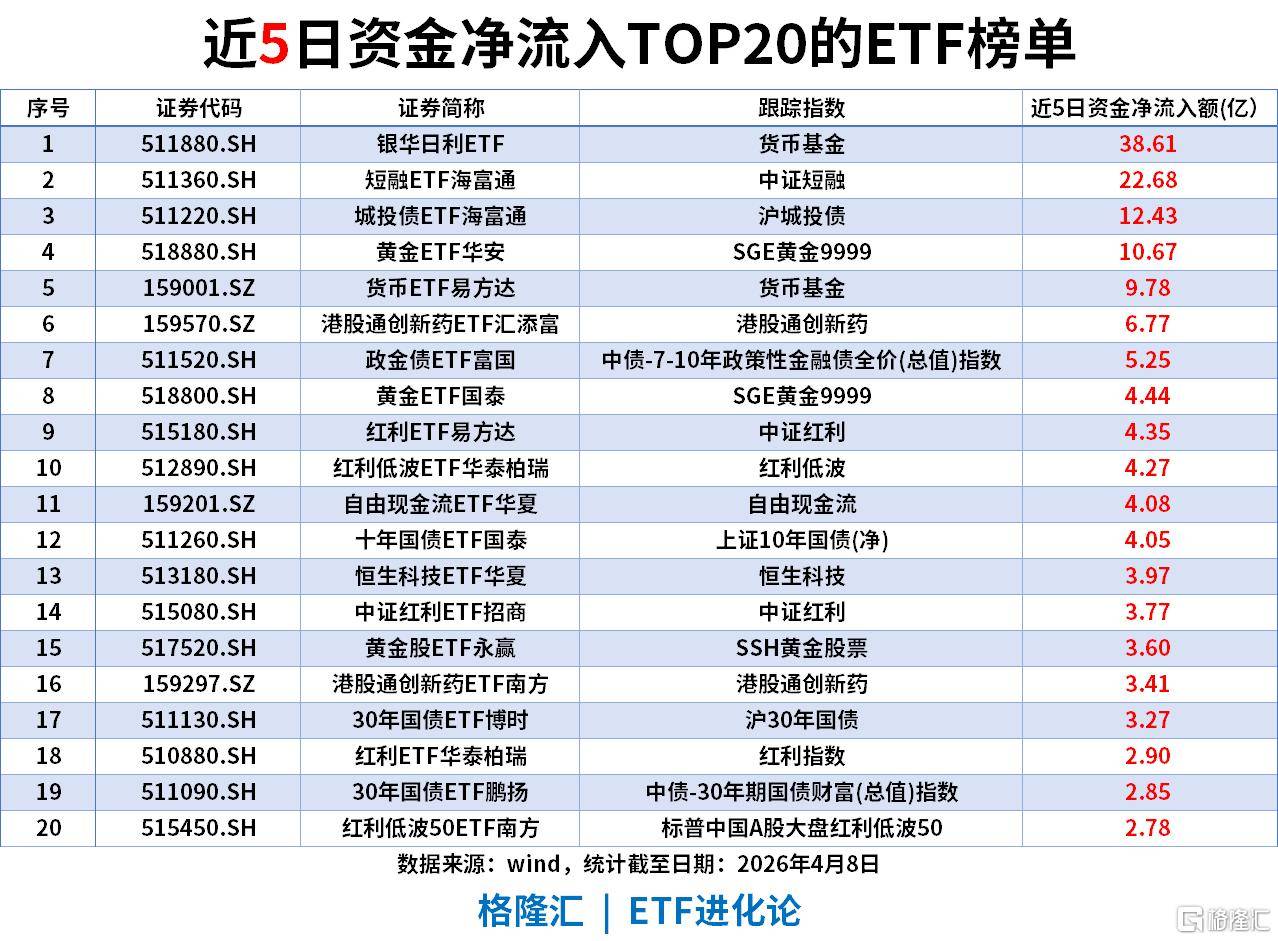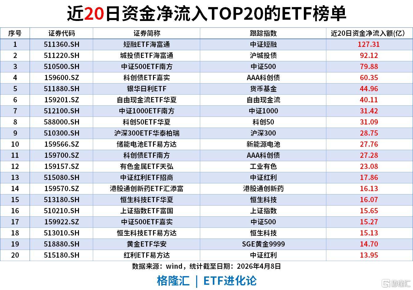 近20日资金主要流向固收、宽基:短融ETF海富通以127.31亿净流入登顶,城投债ETF、科创债ETF、银华日利ETF等固收与货币类ETF合计流入超320亿。