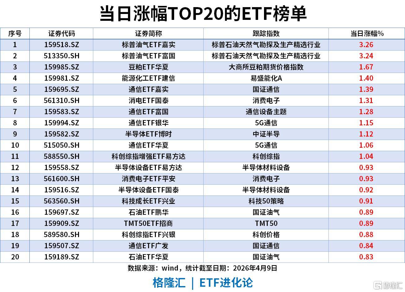 油气能源板块成为当日领涨主线,标普油气ETF包揽榜单前两位,涨幅分别达3.26%、3.24%,能源化工、石油等油气产业链ETF同步走强,能源主题呈现明显的脉冲式上涨;