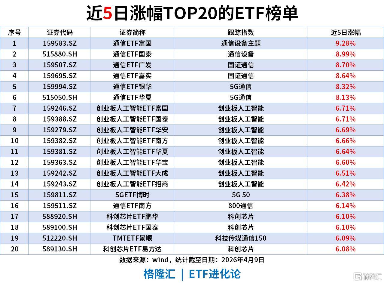 近5日市场风格明显转向科技成长,通信与人工智能板块形成双主线领涨格局。通信行业主题ETF表现尤为突出,通信ETF富国、通信ETF国泰、通信ETF广发、通信ETF嘉实、通信ETF银华和通信ETF华夏累计涨幅超8%。