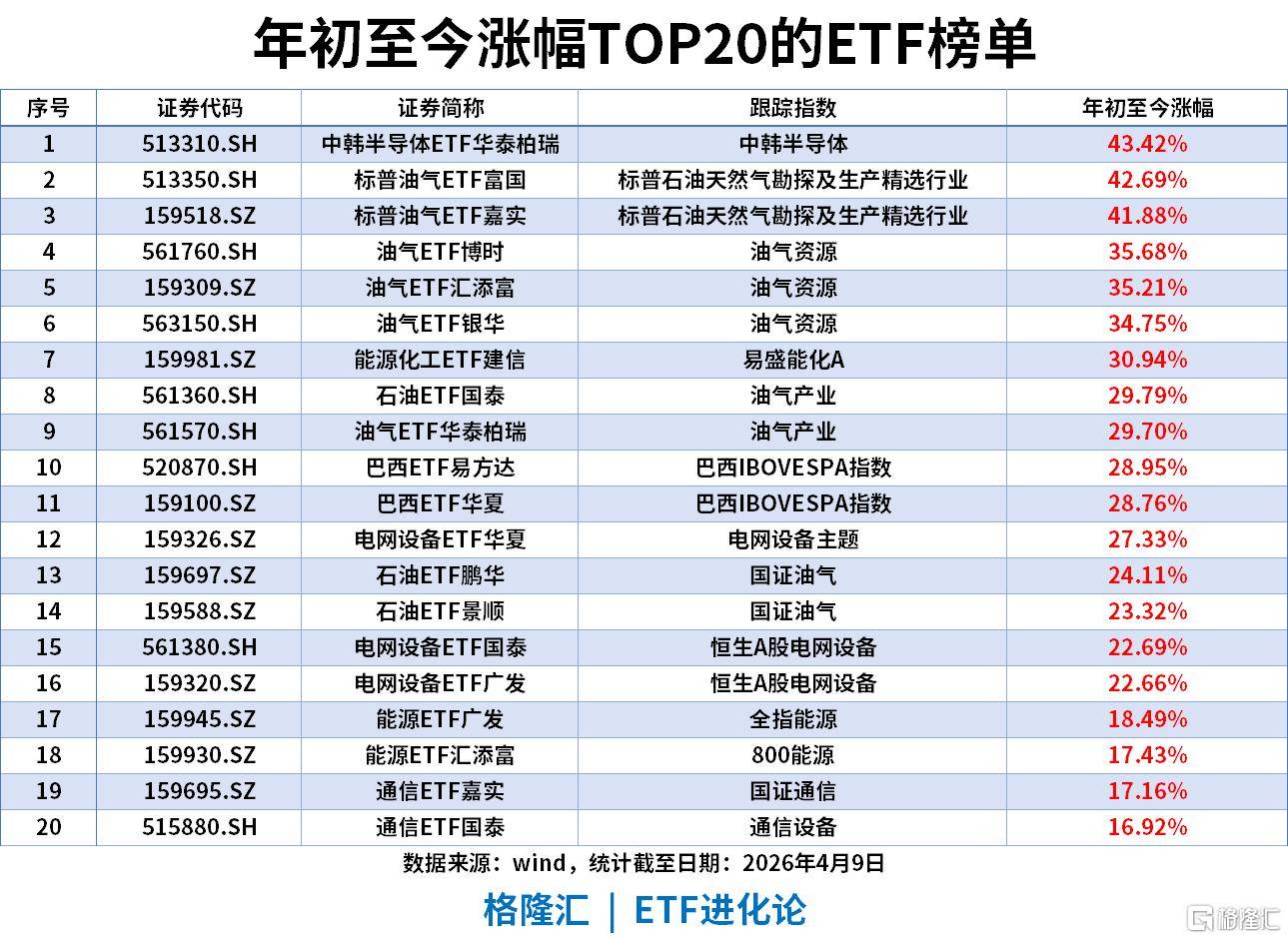 年初至今,油气能源与半导体双主线领跑全市场。中韩半导体ETF以43.42%涨幅登顶年度最强ETF,在国产替代与产业周期回暖背景下,半导体板块全年表现突出。
