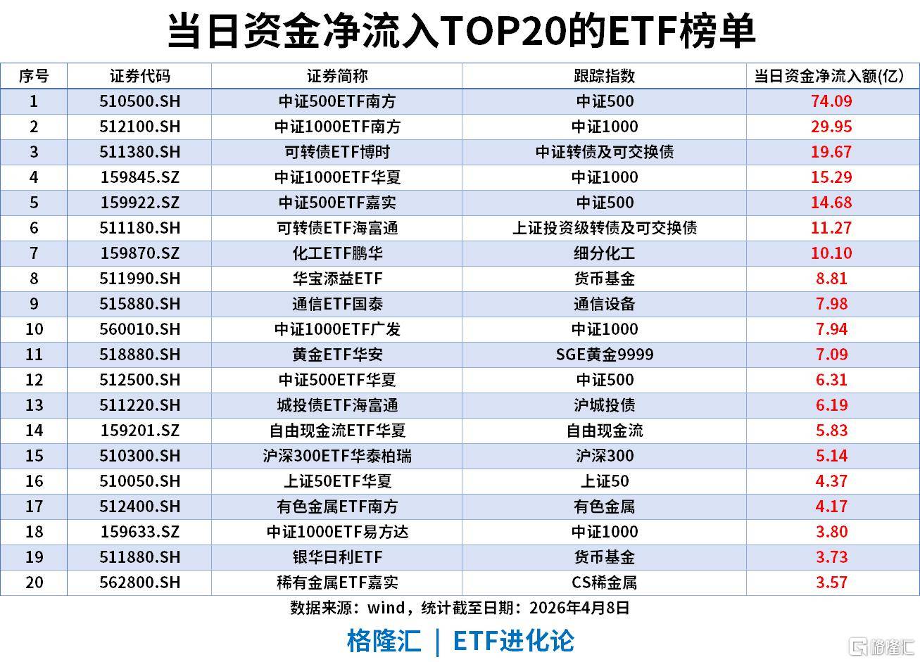 当日资金大幅净流入宽基ETF,中证500ETF南方以74.09亿净流入大幅领跑,中证1000ETF南方、中证500ETF嘉实、中证1000ETF华夏等中小盘宽基合计流入超130亿,成为当日资金最核心的配置方向,市场对中小盘成长风格的共识性加仓特征显著。