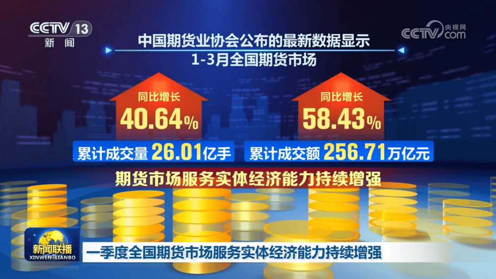 央视网消息(新闻联播):中国期货业协会公布的最新数据显示,1—3月全国期货市场累计成交量为26.01亿手,累计成交额为256.71万亿元,同比分别增长40.64%和58.43%,期货市场服务实体经济能力持续增强。