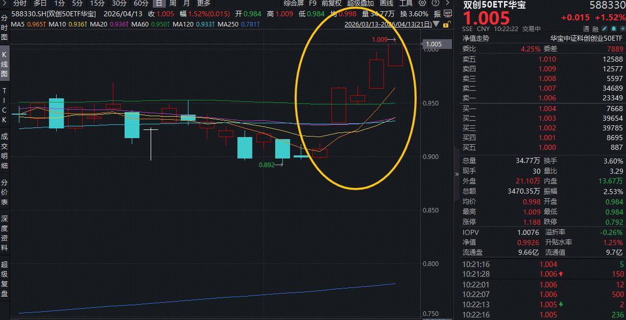 盘面上,今日(4月13日)科技成长方向大反攻,覆盖科创板+创业板高成长龙头的硬科技宽基——双创50ETF华宝(588330)场内价格盘中拉升1.8%,现涨1.52%,冲击日线5连阳,续创历史新高!