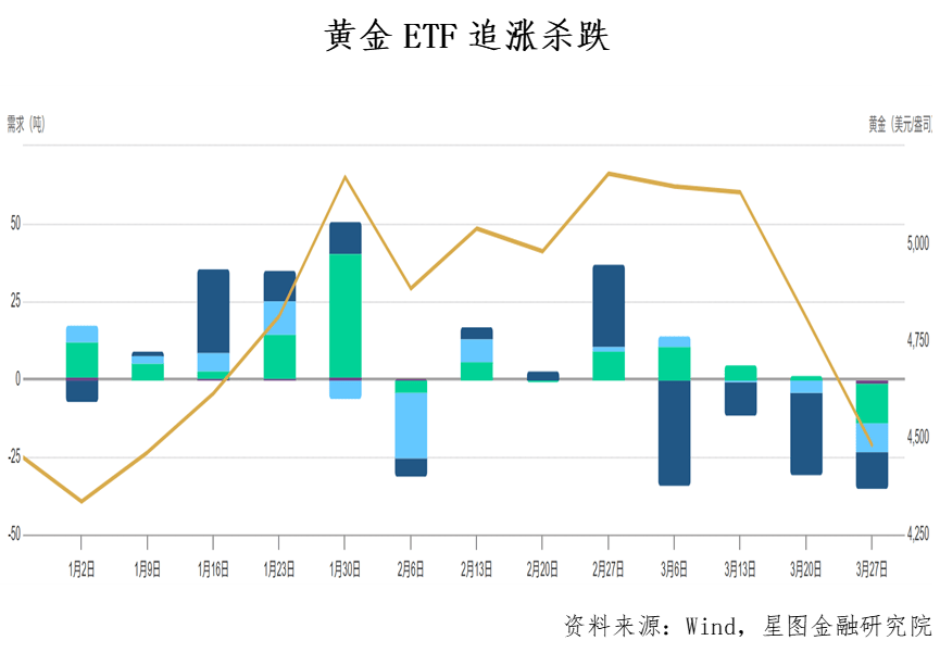 总得来看,黄金ETF在1月、2月、3月分别购入120.6、26.2、-84.8吨,呈现出明显的“追涨杀跌”趋势。