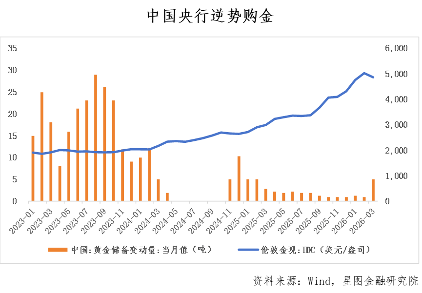 如果进一步观察中国央行持有黄金量变化,则央行对于黄金的看好更加直观:1月和2月,中国央行购金仅为1.24和0.93吨。但到3月,中国央行大力出手,当月购金规模放大至4.98吨,达到近12个月以来的最高水平。