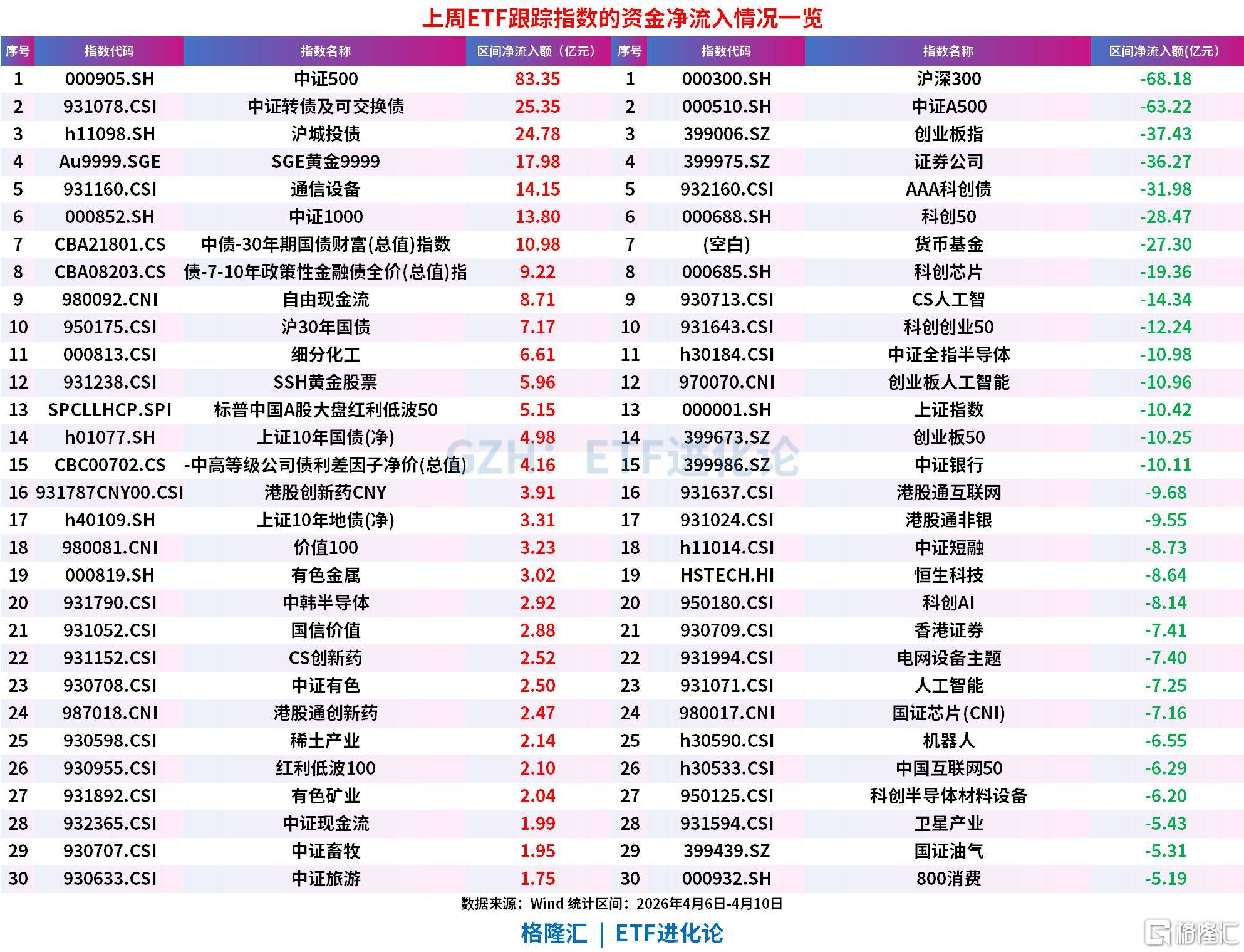 净流入端:中证500指数以83亿元合计净流入领跑,可转债、城投债、国债等固收类产品获稳定流入,中证转债及可交换债、沪城投债分别净流入25亿元和24亿元。