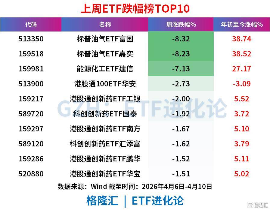 上周(4月6日-4月10日)ETF涨跌幅呈现科技成长赛道集体爆发,油气能源与医药板块大幅回调的极端分化格局:成长主线(通信、消费电子、半导体、AI)全线领涨,而前期强势的油气、能源化工及创新药板块则遭遇集中下跌。