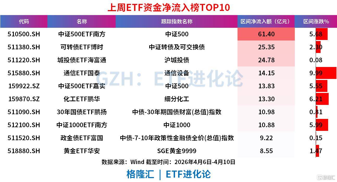 中证500ETF南方、可转债ETF博时、城投债ETF海富通、通信ETF国泰、中证500ETF嘉实、化工ETF鹏华上周分别净流入61.40亿元、25.35亿元、24.78亿元、14.15亿元、13.83亿元、13.30亿元。