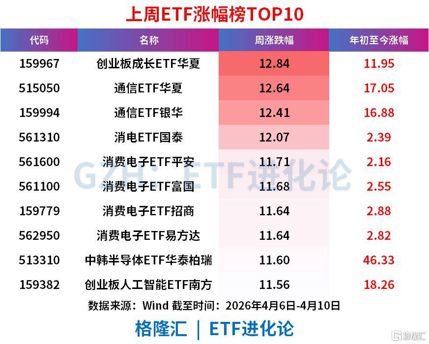 成长赛道共振:创业板成长、创业板人工智能ETF周涨幅超11.5%,中韩半导体ETF周涨11.6%,AI、半导体等科技成长板块集体走强。