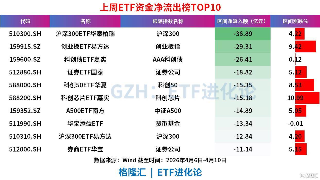 沪深300ETF华泰柏瑞、创业板ETF易方达、科创债ETF嘉实、证券ETF国泰、科创50ETF华夏分别净流出36.89亿元、29.31亿元、26.41亿元、18.82亿元、15.35亿元。