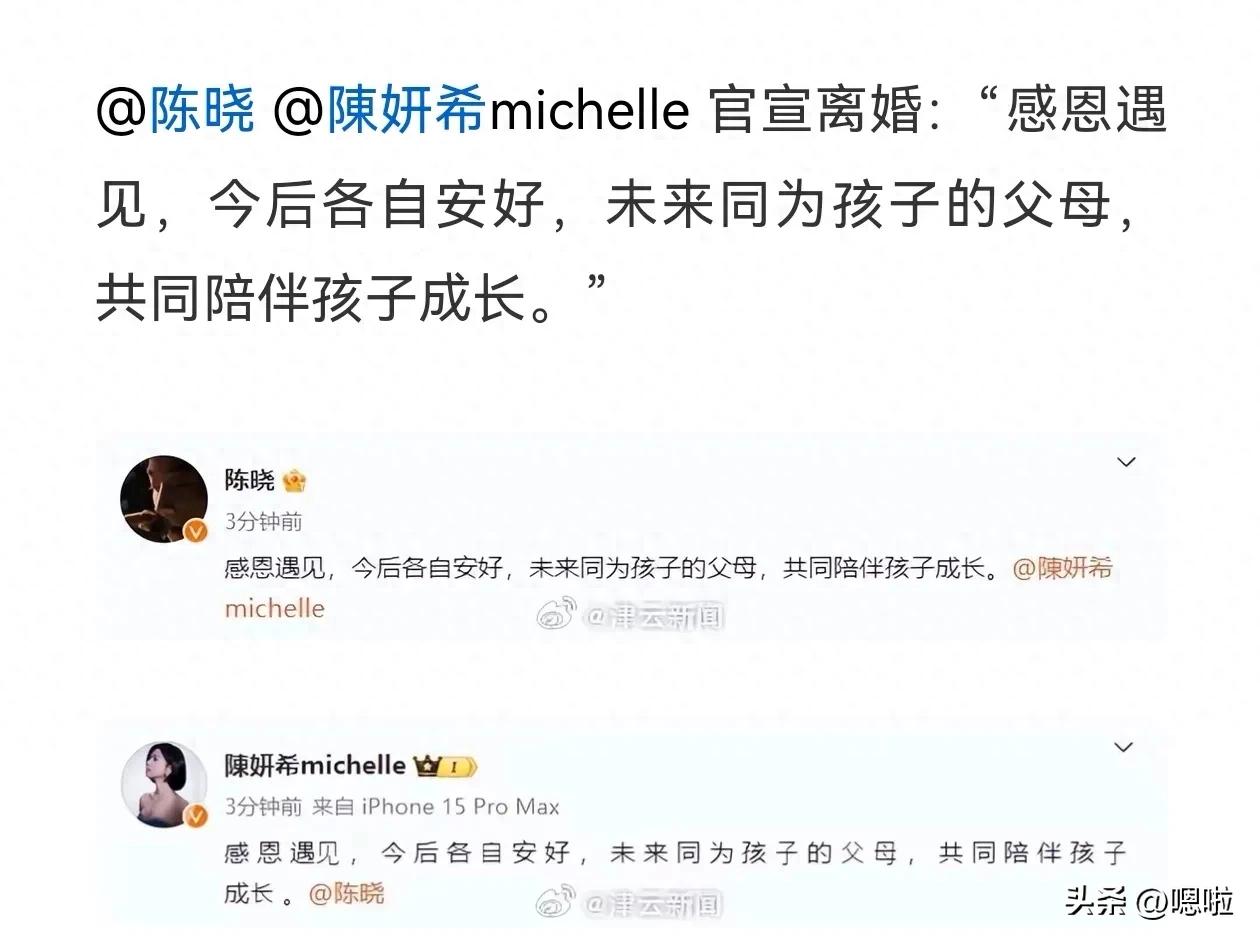 今天娱乐圈的顶级大瓜,就是陈晓陈妍希已经坐实了离婚传闻,并且二人已经互动证实。
