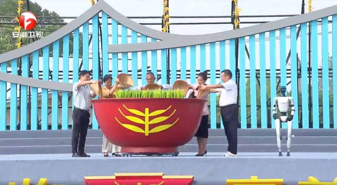 政知君注意到,此次的安徽主场活动,“科技范”十足,具身机器人、机器狗等新科技产品亮相现场,在联欢活动现场,开启联欢活动序幕的,除了有5位农民代表,还有人形机器人。