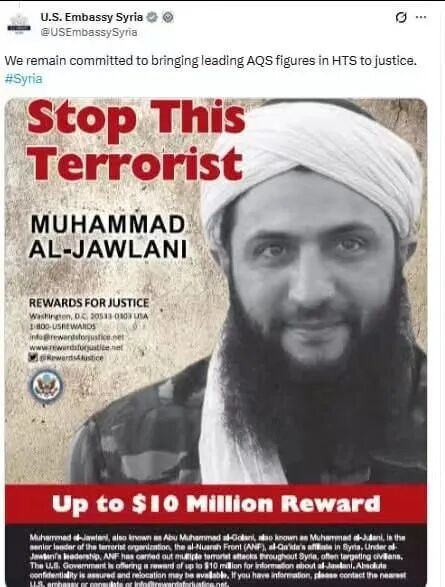 因为他当时还叫朱拉尼,他曾是叙利亚“基地组织”创始人,他还一度加入过“伊斯兰国”,他双手沾染过很多美国人的血。