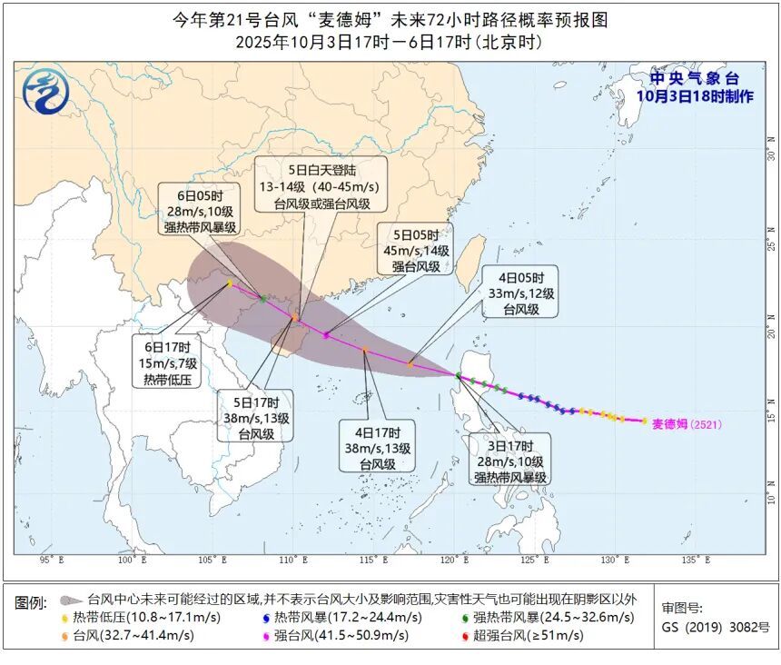 这意味着“麦德姆”5日可能以巅峰强度登陆广东西南部到海南东部一带。台风一旦靠近陆地后突然爆发增强,留给防范的时间相对较短,不利于采取对应的防御措施。近日将前往广东西部、海南岛的朋友,请密切关注台风动态,提前做好防御准备。