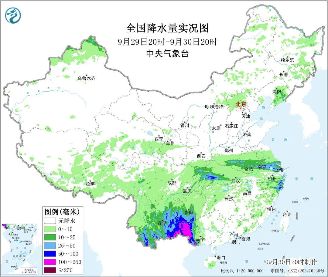 国家级气象站中,9月29日20时至30日20时,广西德保186.8毫米、田林137.2毫米、百色119.3毫米,云南西畴118.9毫米,均打破当地9月单日降水量纪录,云南屏边156.5毫米打破当地观测史单日降水量纪录。
