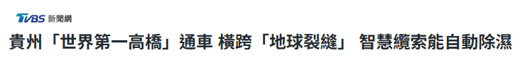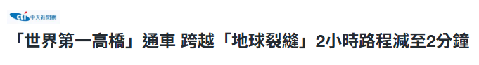 台湾“中天新闻网”援引总台报道介绍,花江峡谷大桥全长2890米,通车后,原本需要绕行2小时的峡谷两岸,现在仅需2分钟即可往来,可谓天堑变通途。