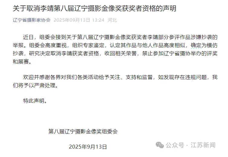 今年9月,辽宁传媒学院美术系主任、摄影专业教师李靖被第八届辽宁摄影金像奖组委会认定摄影作品抄袭,曾引发广泛关注。